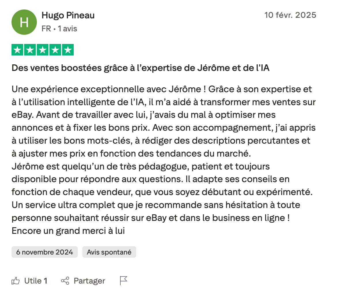 Est-ce que ce programme est adapté à toutes les plateformes de e-commerce ? Bien sûr que oui ! Le e-commerce, que ce soit sur eBay, Amazon ou Shopify suit des principes universels : la recherche de produits gagnants, la rédaction d’annonces persuasives, une tarification optimale. Les prompts IA que je vous propose fonctionnent partout en e-commerce.